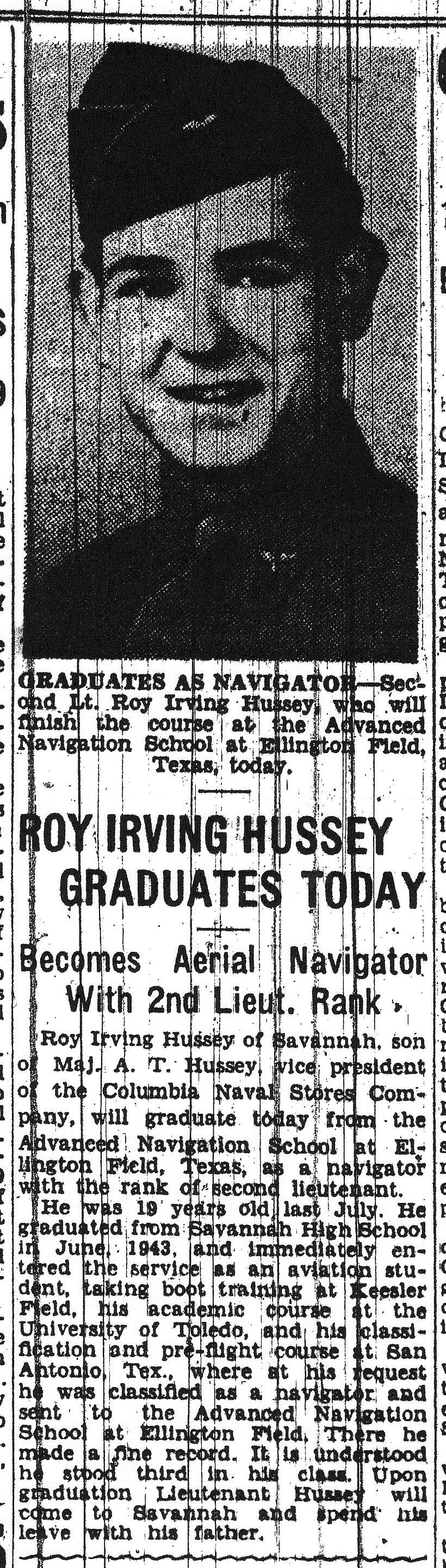At the beginning of 1944, Cadet Hussey was ordered to San Antonio, Texas for "Classification", where he had to pass rigorous physical and aptitude examinations to qualify for flying duty. The classification center's purpose was to steer cadets toward the aviation specialty to which they were best suited. This involved long series of physical and mental tests. Among those that eliminated some aspirants were a test of depth perception and a test of ambidexterity. The aggregate aptitude rankings (from 1 to a high of 9) required were navigator-9, pilot-8, and bombardier-8. Drills, parades, lectures, and casual duties kept the cadets busy between tests. Now classified as a potential Navigator, Roy entered Pre-flight training on Feb 25, 1944. Pre-flight was a continuation of Classification without the tests and did not involve flying. Finally in June, it was time for Navigation training at Ellington Field, Texas. The concentration was on the serious business of learning aerial navigation as well as the complexities of weather and recognizing planes and ships of friends and foes. The basics of radio communication were learned and each cadet had to pass a Morse Code test of sending and receiving dots and dashes at the rate of six words a minute. At Ellington they were finally flying. The small cabin of twin-engined AT-7s carried an instructor supervising three cadets, each furnished with desk and instruments showing the plane's airspeed and altitude. Here using the plane's instruments, the drift meter, a circular slide rule and a protractor/ruler, they plotted their course by estimating ground speed and relative wind. They were graded not only on the accuracy of their plot but also on how well they recorded important data on their log of the flight. On October 2, 1944, Cadet Roy Hussey graduated and was commissioned 2nd Lieutenant Roy I. Hussey, O-2072464, MOS 1034 [Military Occupational Specialty: Navigator].