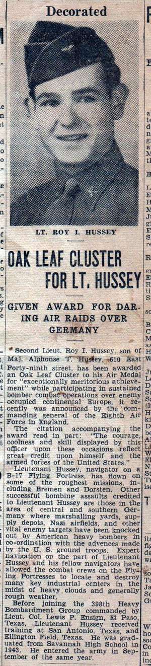 After home leave in Savannah and New York, he was ferried to England where he was assigned to the 8th Air Force, 1st Air Division, 398th Bombardment Group (Heavy) known as "Hell from Heaven" stationed in Nuthamstead, England. Roy joined a B-17G Flying Fortress crew of the 603rd Squadron known as Donovan's crew. He would finish the war with the same crew and the same plane, which the crew never named. During the last two months of the war, Roy flew 18 missions in the final push to VE Day. For more on the missions he flew, click here